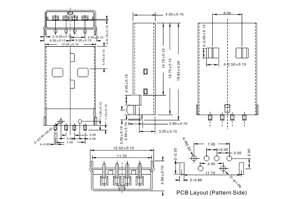 USB 2.0 connector, 90-degree angle, fully inserted