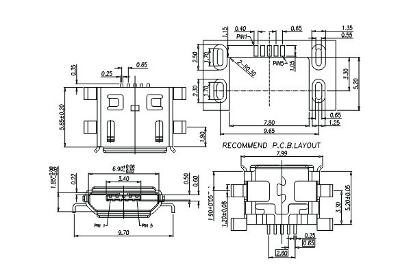 USB 2.0 connector, Micro type, 5-pin, recessed board-mounted, 0.7-inch, four-pronged fully inserted