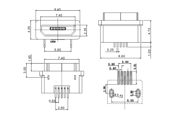 USB 2.0 connector, Micro type, 5-pin, waterproof, front insertion, back mounting