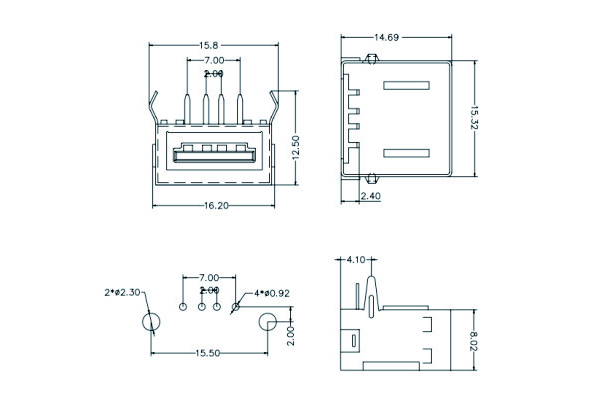 USB 2.0 connector, 90-degree angle, full package, bent pins