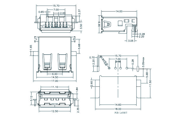 USB 2.0 connector, 90-degree angle, recessed plate, 3.5 on the board